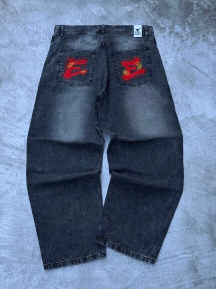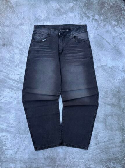 Pantalón de mezclilla en tono gris oscuro con acabado desgastado tipo vintage que le da un look street bien marcado. Corte recto ligeramente amplio, ideal para outfits urbanos.